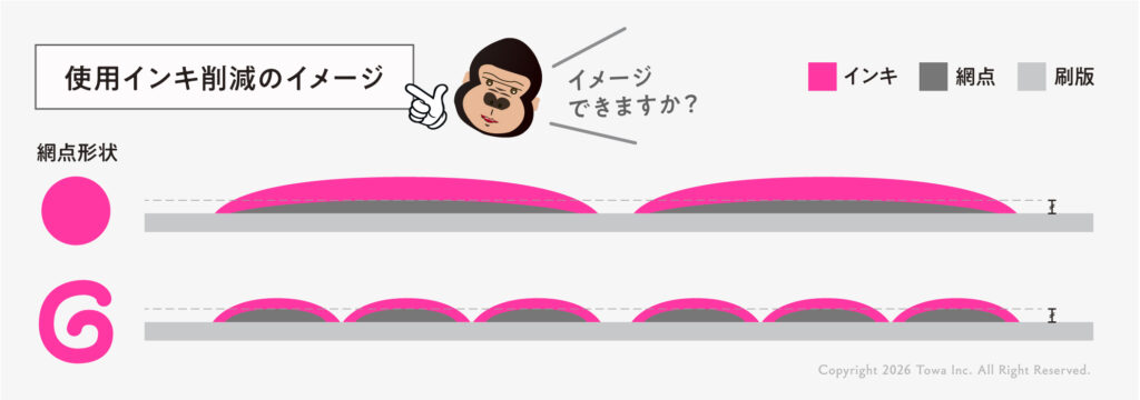この独自の網点形状により、印刷時のインキ使用量を削減できるとのこと。