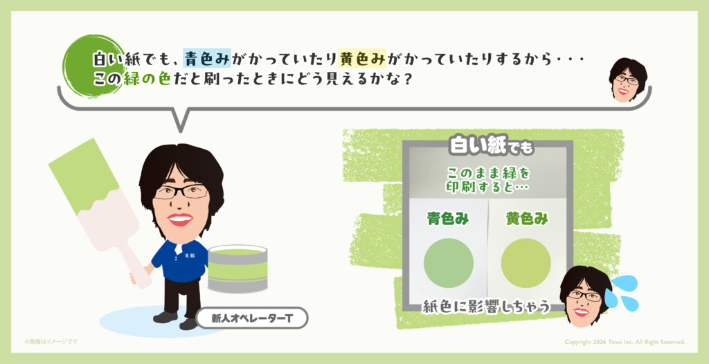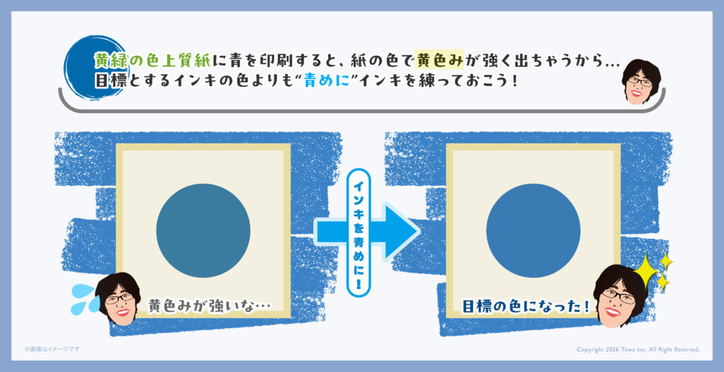 「この紙に⻘⾊のインキを刷ると紙の⾊が反映されて⻩⾊みが強く出てしまう。紙の⾊を考慮して⽬標とするインキの⾊よりも⻘めに練ってバランスを整えよう。」