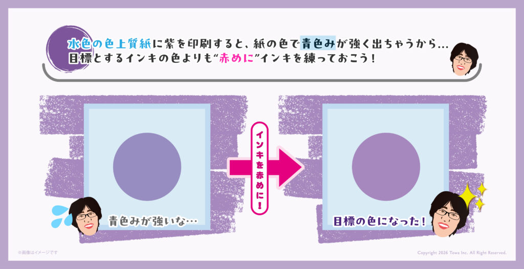 「この紙に紫⾊のインキを刷ると紙の⾊が反映されて⻘⾊みが強く出てしまう。紙の⾊を考慮して⽬標とするインキの⾊よりも⾚めに練ってバランスを整えよう。」